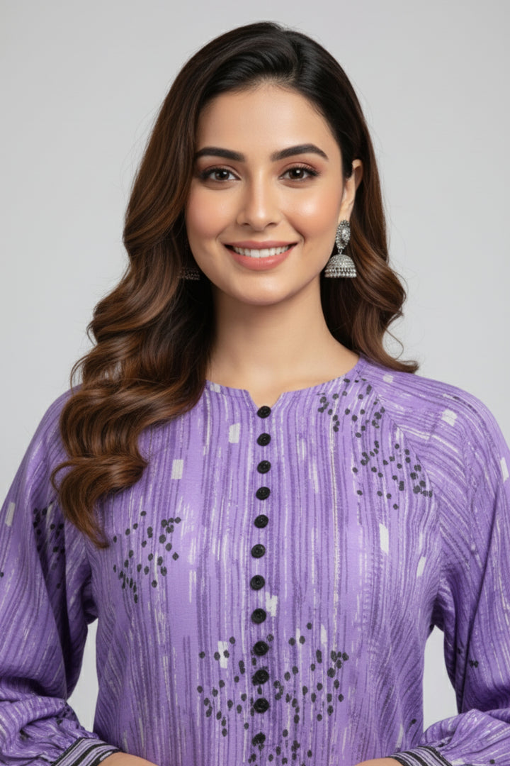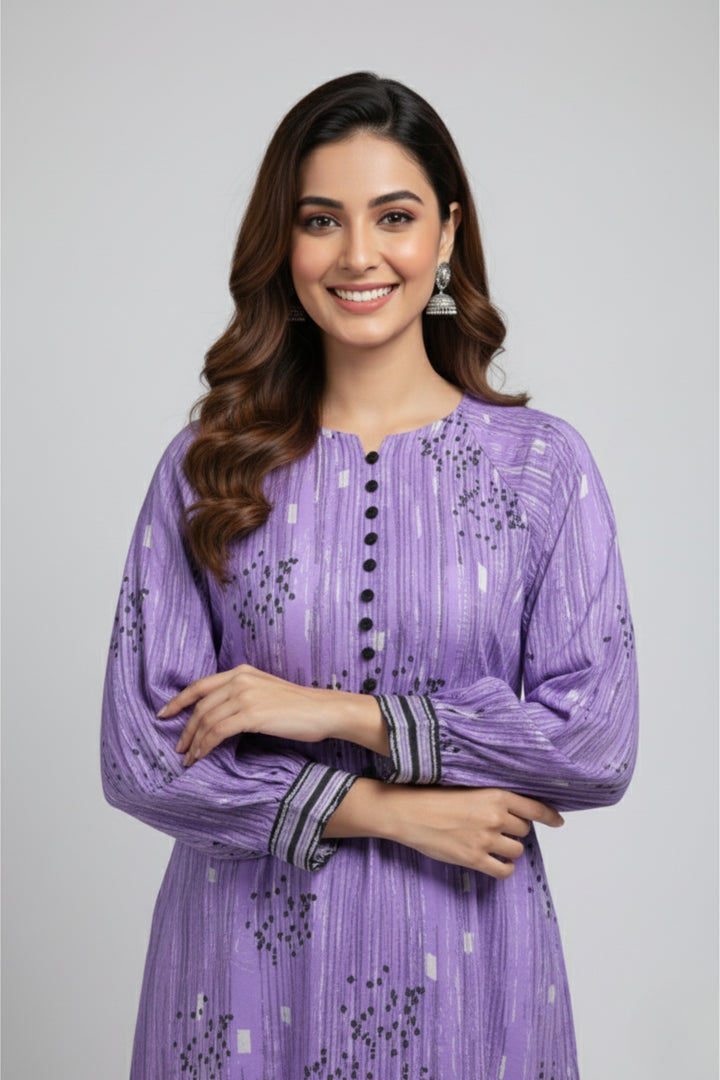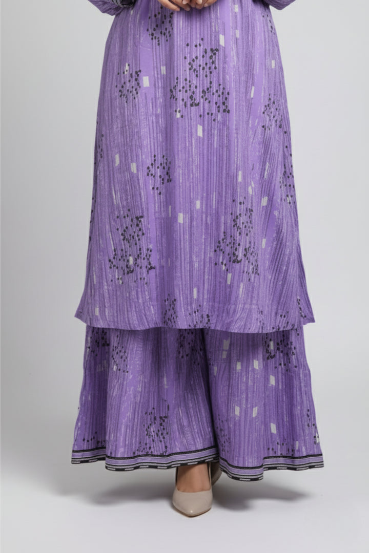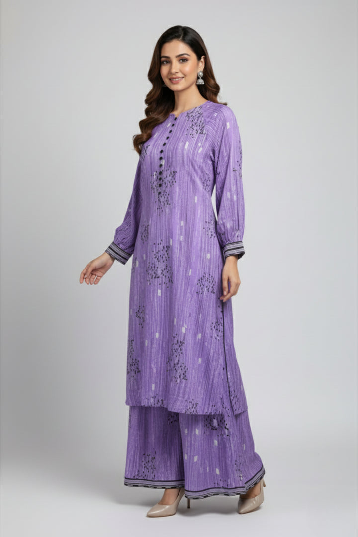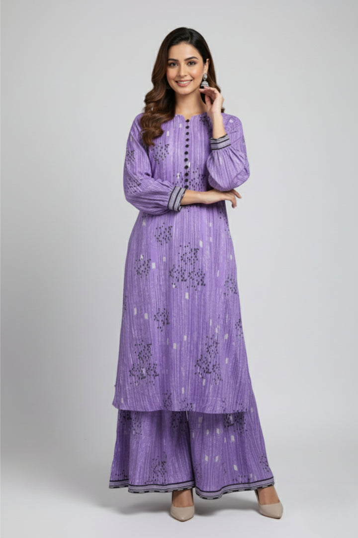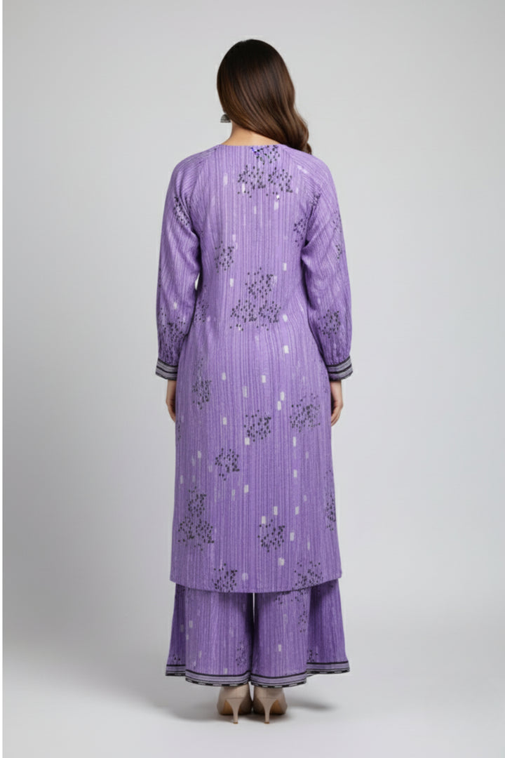 "Embrace elegance with this beautiful two-piece purple stitched dress. The set features a finely crafted shirt and a matching trouser, designed for a sophisticated and stylish look. The rich purple hue makes it an excellent choice for a variety of events