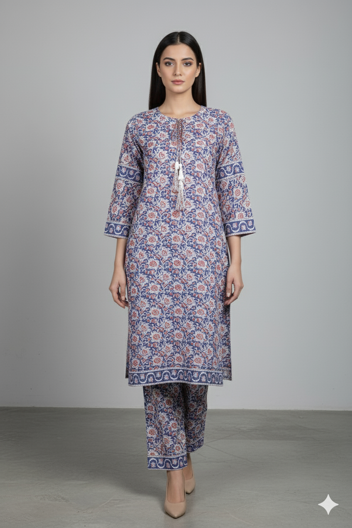 This elegant ensemble features a long tunic (kameez) with a classic round neckline, complete with a tasteful slit and decorative white tassels. The entire tunic is adorned with a lush, all-over floral pattern, while the three-quarter sleeves and hemline are accented with a sophisticated geometric border in coordinating blue and white. The straight-cut trousers perfectly match the tunic with the same delightful floral print and geometric border at the cuffs.